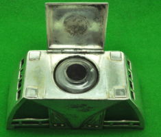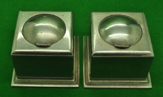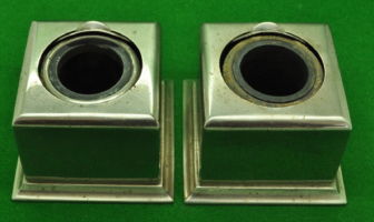 Pair of flip top Nickel Silver inkwells with black hard rubber liners. Both work perfectly. Measure 75 mm square.