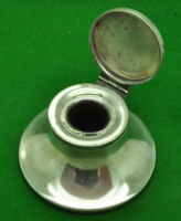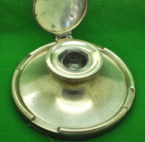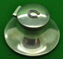 German Solid Silver Circular Ink Well. (Silver Plated Base). Enameled Horse shoe emblem on the top. In Perfect condition. Measures 81 mm in diameter.