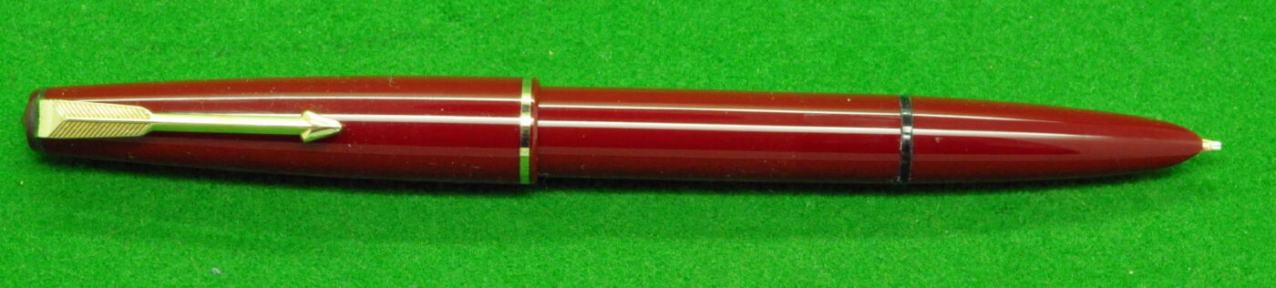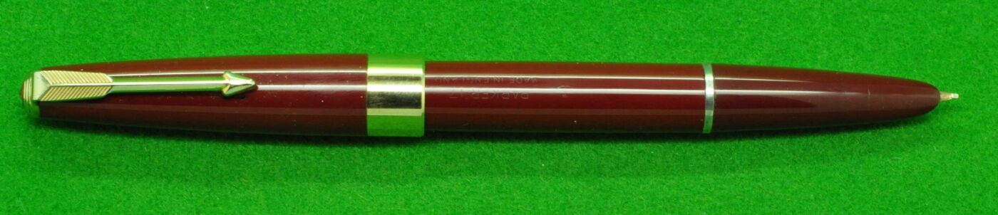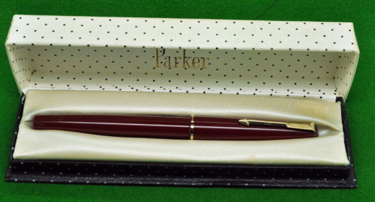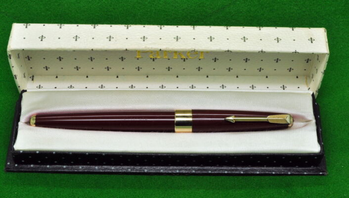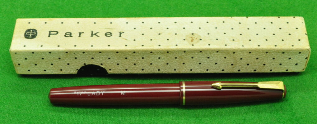 Parker 17 lady in Crimson with gold filled trim. This pen is in remarkable MINT Unused condition with chalk marks in original box. Fitted with the original 14kt gold medium tipped nib. Aerometric fill