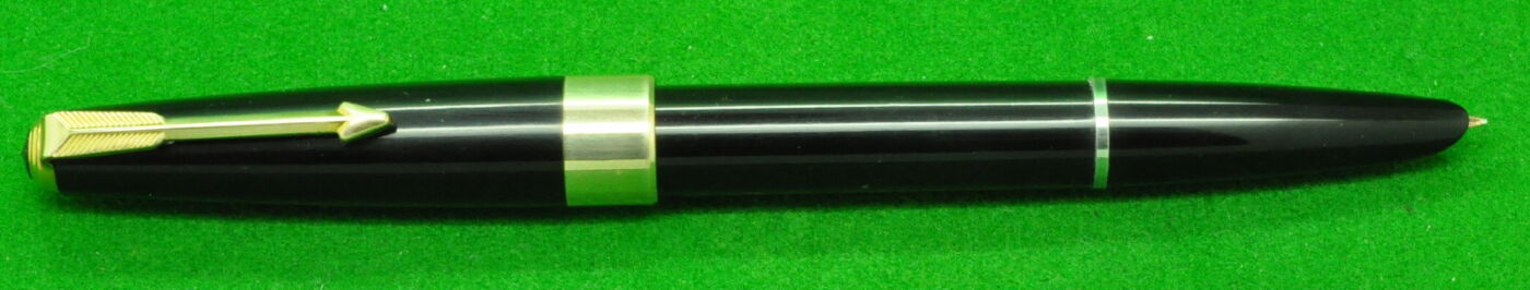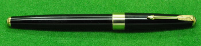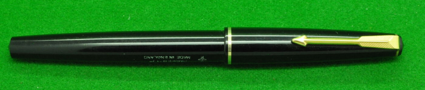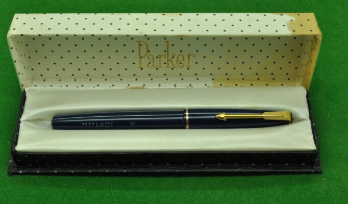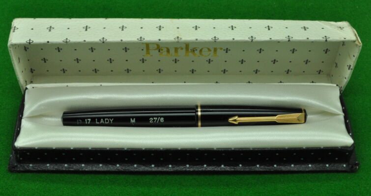 Parker 17 lady in Black with gold filled trim. This pen is in remarkable MINT Unused condition with chalk marks in original box. It has never been inked. Fitted with the original 14kt gold medium tipped nib. Aerometric fill
