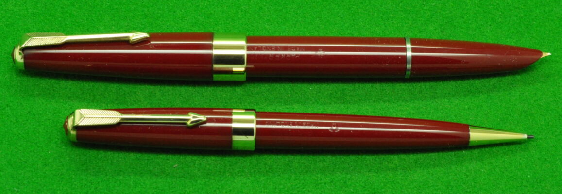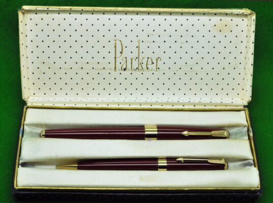 Parker 17 Super Duofold SET in Crimson and Gold fill. Fountain Pen and Pencil – Both In Absolute MINT Condition in original box . Fountain Pen – Aerometric fill. Fitted with the original 14kt gold Super Smooth Medium tipped nib