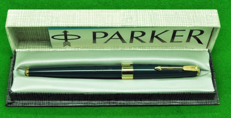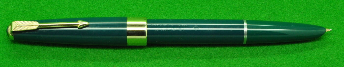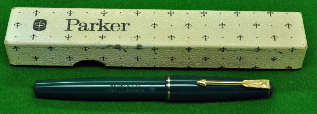 MINT Parker 17 In Green with gold fill trim. Aerometric fill. In Original Box. Fitted with the original 14kt medium tipped nib
