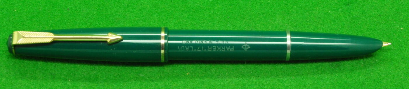 Parker 17 lady in Green with gold filled trim. MINT Unused condition in original box. Fitted with the 14kt gold medium tipped nib. Aerometric fill