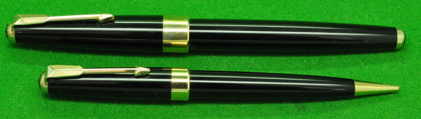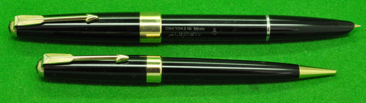 Parker 17 Super Duofold SET in Black and Gold fill. Fountain Pen and Pencil. Both In Absolute MINT Condition. Fountain Pen Aerometric fill. Fitted with the original 14kt gold Super Smooth Medium tipped nib