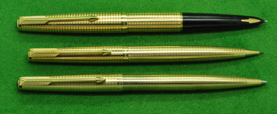 Parker 61 Consort Insignia TRIPLE set in Gold filled Geometric Pattern. Fountain Pen , Ballpoint and Pencil. All in Absolute MINT Condition in original Box. Fountain Pen fitted with the original 14kt gold medium tipped Nib.