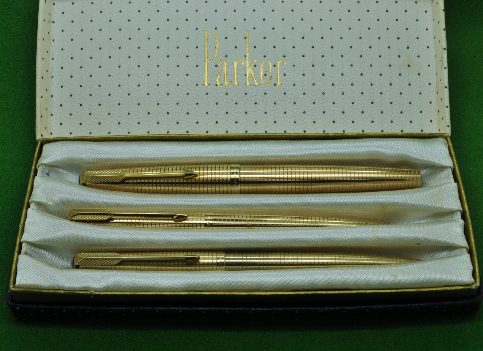 Parker 61 Consort Insignia TRIPLE set in Gold filled Geometric Pattern. Fountain Pen , Ballpoint and Pencil. All in Absolute MINT Condition in original Box. Fountain Pen fitted with the original 14kt gold medium tipped Nib.