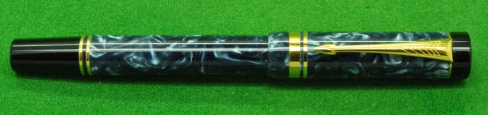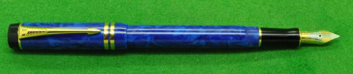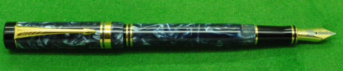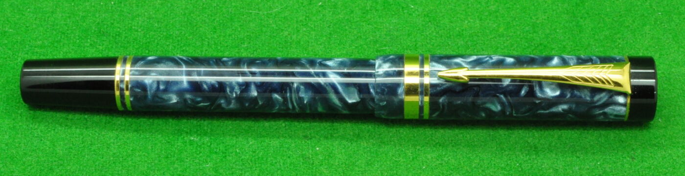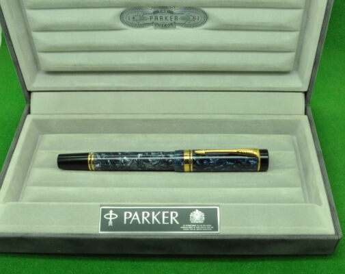 Parker Duofold International Mk 1 in Blue Marble with gold filled trim. In MINT Condition in original Box. Fitted with the original twin tone 18kt gold medium tipped nib.