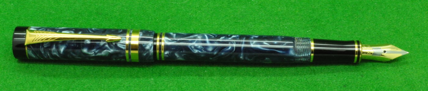 Parker Duofold International Mk 1 in Blue Marble with gold filled trim. In MINT Condition . Fitted with the original twin tone 18kt gold medium to fine tipped nib.