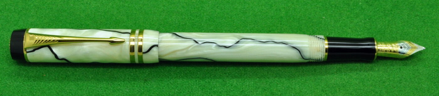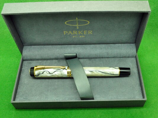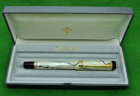 Stunning Parker Duofold International in Pearl & Black with gold filled trim. In Absolute MINT Unused condition in original Parker box . Fitted with the original 18kt Twin tone Medium tipped nib.