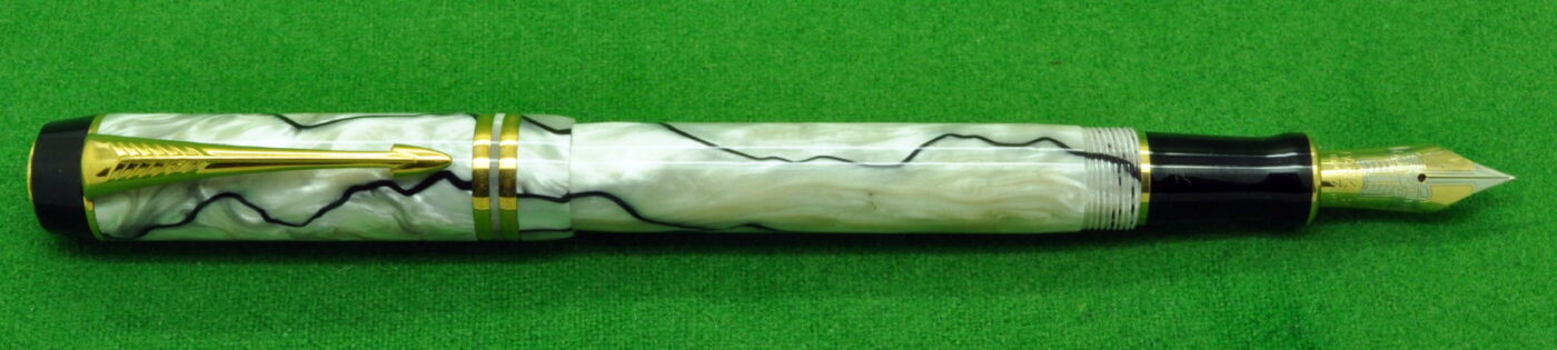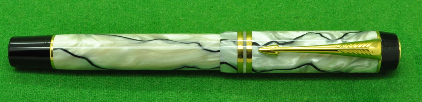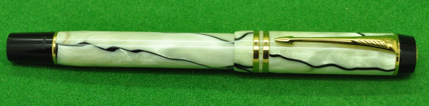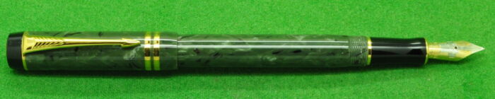 Stunning Parker Duofold International in Marbled Jade Green with gold filled trim. In Absolute MINT Unused condition. Fitted with the original 18kt Twin tone Medium tipped nib.