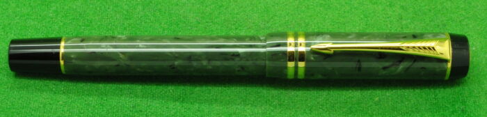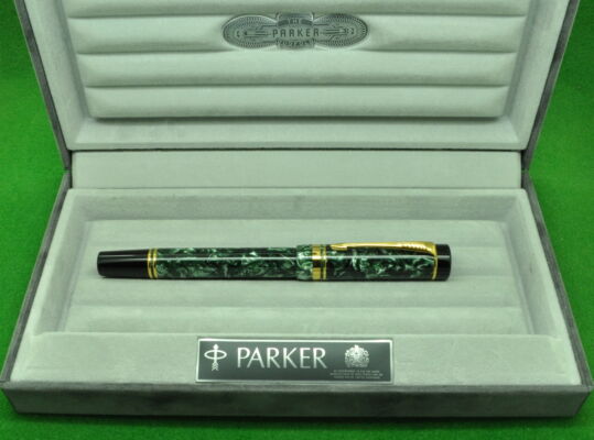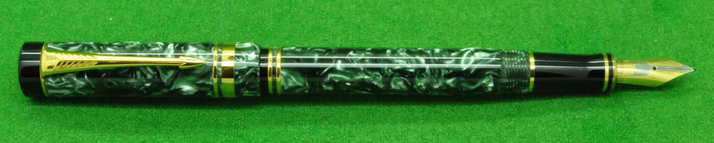 Parker Duofold International Mk 1 in Green Marble with gold filled trim. In MINT Condition in Parker Box . Fitted with the original twin tone 18kt gold medium tipped nib.