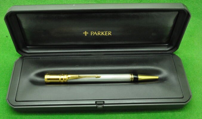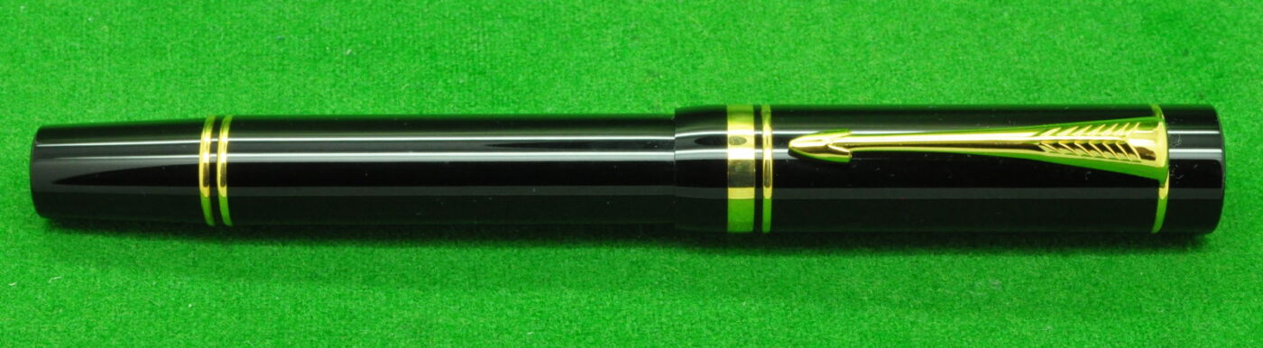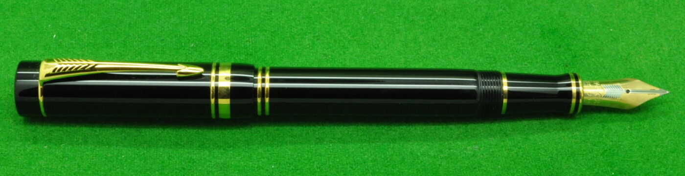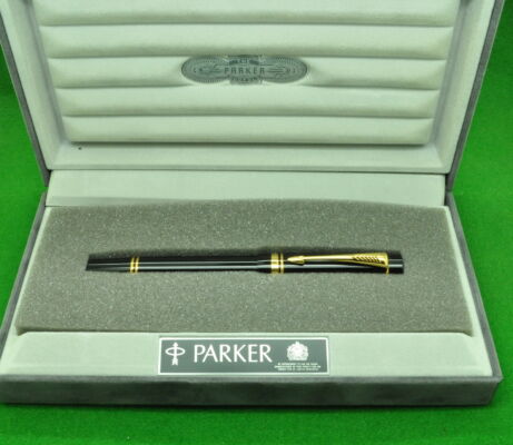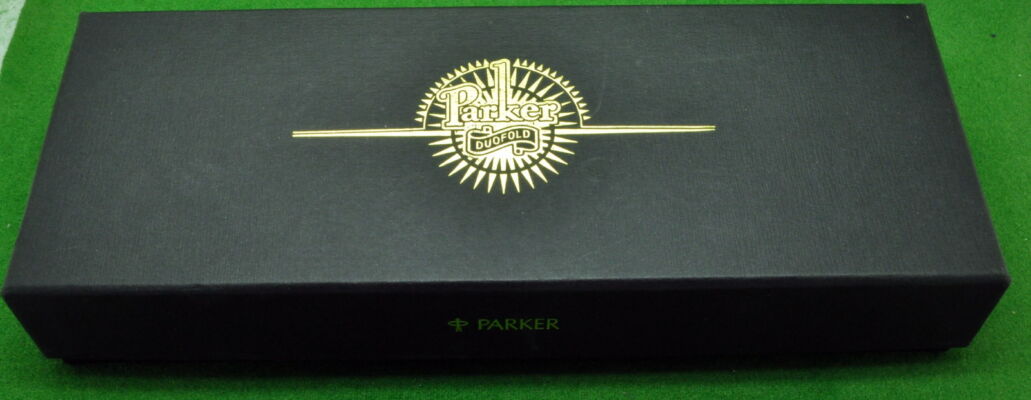 Parker Duofold Centennial Mk 1 in Black with gold filled trim. In Absolute MINT unused Condition in original Box. Fitted with the original twin tone 18k gold fine tipped nib