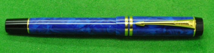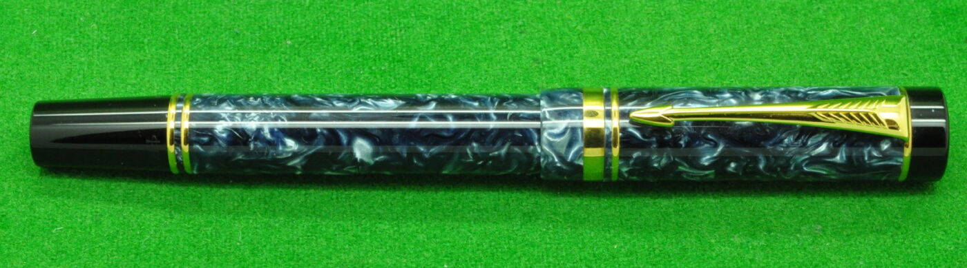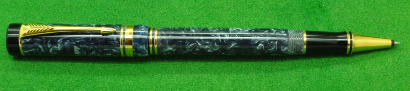 Parker Duofold International Rollerball in Blue Marble with gold filled trim. In Absolute MINT Unused Condition in Original Box with outer box and Paperwork. Fitted with the original 18kt gold twin tone fine tipped nib.