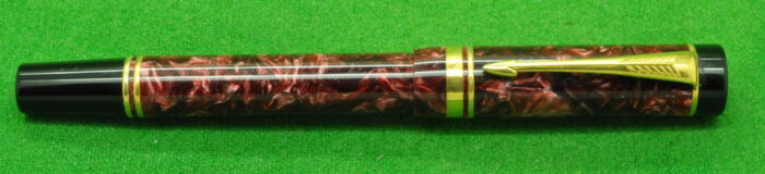 Parker Duofold International Mk 1 in Burgundy Marble with gold filled trim. In MINT Condition . Fitted with the original twin tone 18kt gold medium tipped nib.