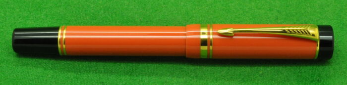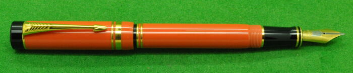 Special Edition Parker Duofold Centennial Mk 1 in Orange with gold filled trim. In Absolute MINT unused Condition. Fitted with the original twin tone 18k gold medium tipped nib