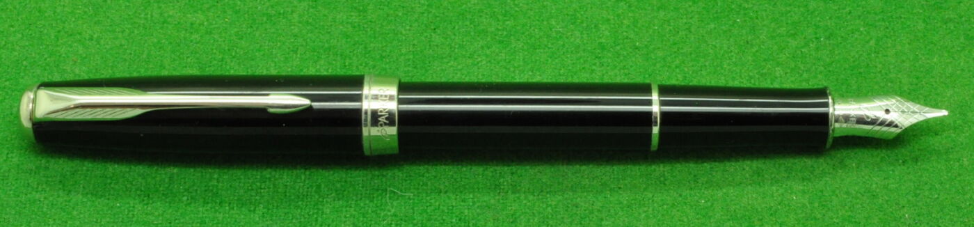 Parker Sonnet in Black Laque with Chrome trim. In Near Mint Condition. Fitted with the original 18kt white gold medium tipped nib.