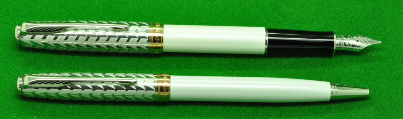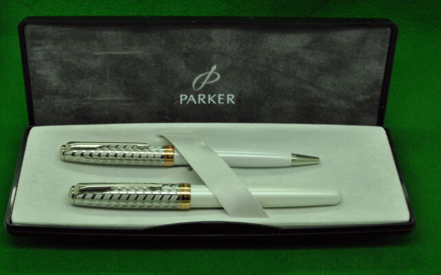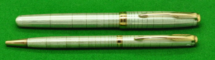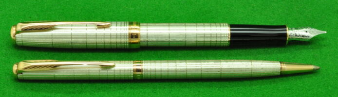 Parker Sonnet Prestige Silver Chiselled SET in Geometric Pattern Solid Sterling Silver with Rose Gold fill. Fountain Pen and Ballpoint. Both in Mint condition. Fountain Pen fitted with the original white 18kt gold medium tipped nib.