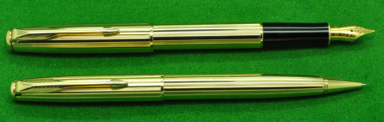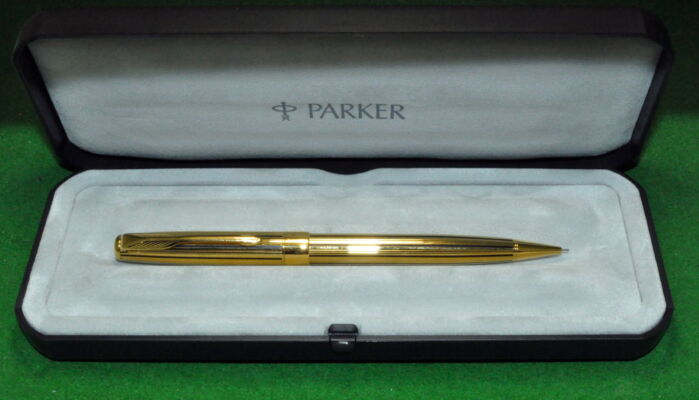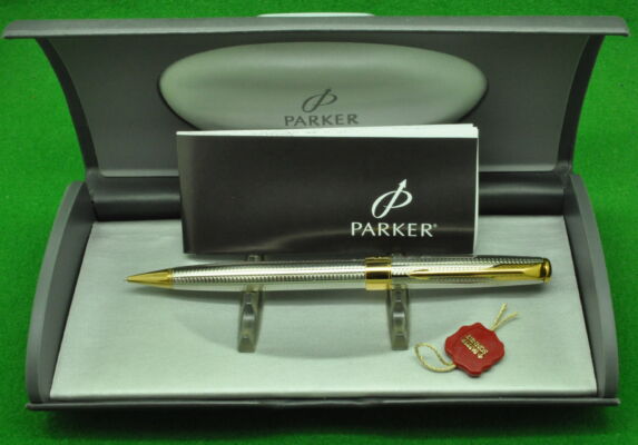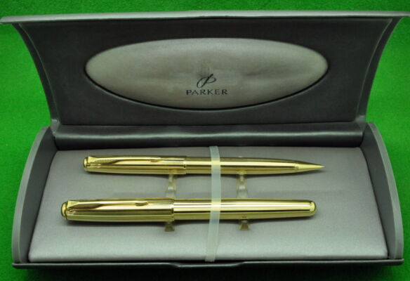 Parker Sonnet SET In Gold fill – Fine Line Pattern. Fountain Pen and Pencil. Both In MINT condition in original Box. Fountain pen fitted with the original medium tipped nib.