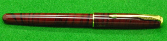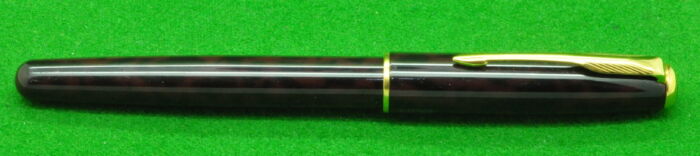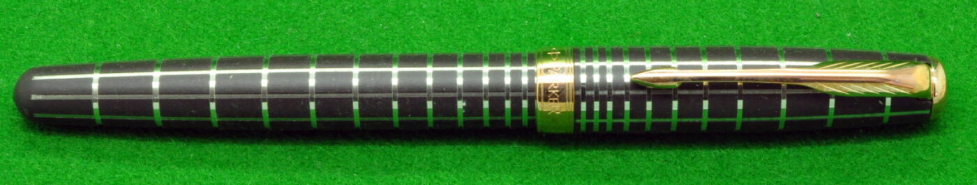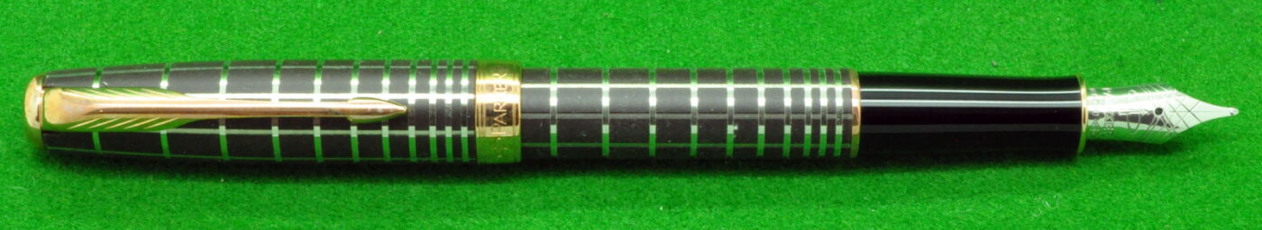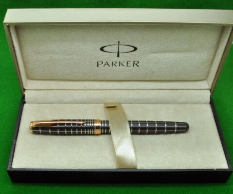 Scarce Original Version of Parker Sonnet in Brown Rubber Laque with Grid design. Rose Gold filled trim. In Absolute MINT Condition in original Box. Fitted with the original White 18kt gold medium tipped nib.