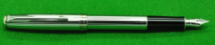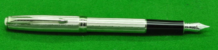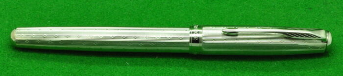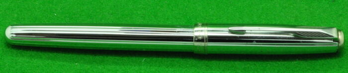 RARE Parker Sonnet In Polished Chrome, Godron Pattern. Possibly a trial finish as this design does not appear to be documented and “Sample” is written on the cap band. Very Similar to the Much sought after Monochrome but this one has plain lines and is an earlier pen. In absolute MINT Unused condition. Fitted with the original Medium tipped nib.