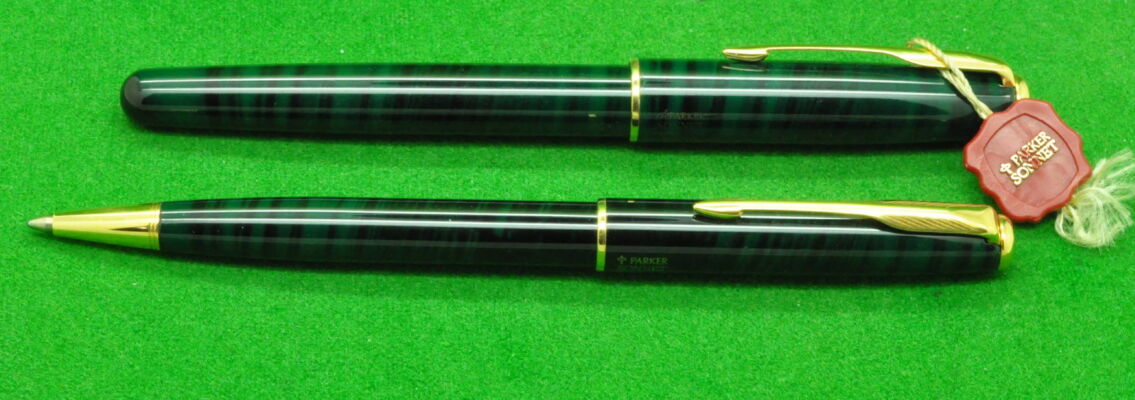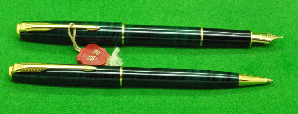 Sonnet SET in Green Laque with gold filled trim. Fountain Pen and Ballpoint. Both in absolute MINT condition. Fountain Pen fitted with the original medium tipped nib.