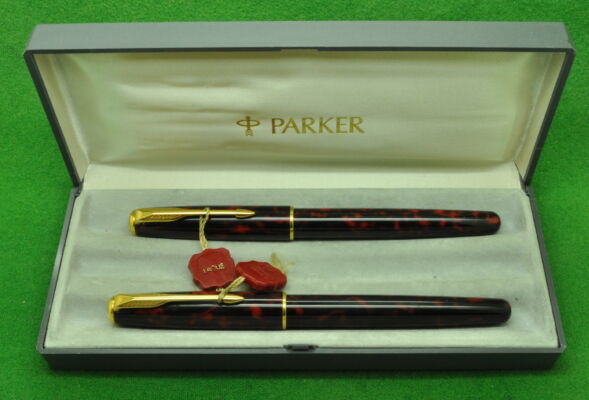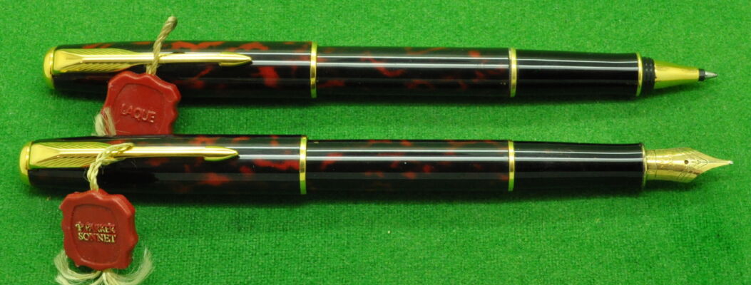 Sonnet SET in Laque Autumn red with Gold fill trim. Fountain Pen and Rollerball. Both in Absolute Mint Unused condition in original Box. Fountain Pen fitted with the original 14kt gold medium tipped nib.