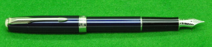 Parker Sonnet in Stainless with Chrome Trim. In Mint Condition. Fitted with the original ultra Smooth, Semi Flex Broad tipped nib giving a wonderful writing style.