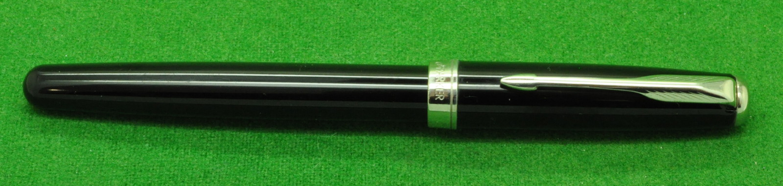Parker Sonnet in Black Laque with Chrome trim. In Near Mint Condition. Fitted with the original 18kt white gold medium tipped nib.