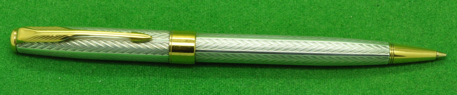 Parker Sonnet Prestige Silver Chiselled Ballpoint in Geometric Pattern Solid Sterling Silver with Rose Gold fill. In Near Mint condition.