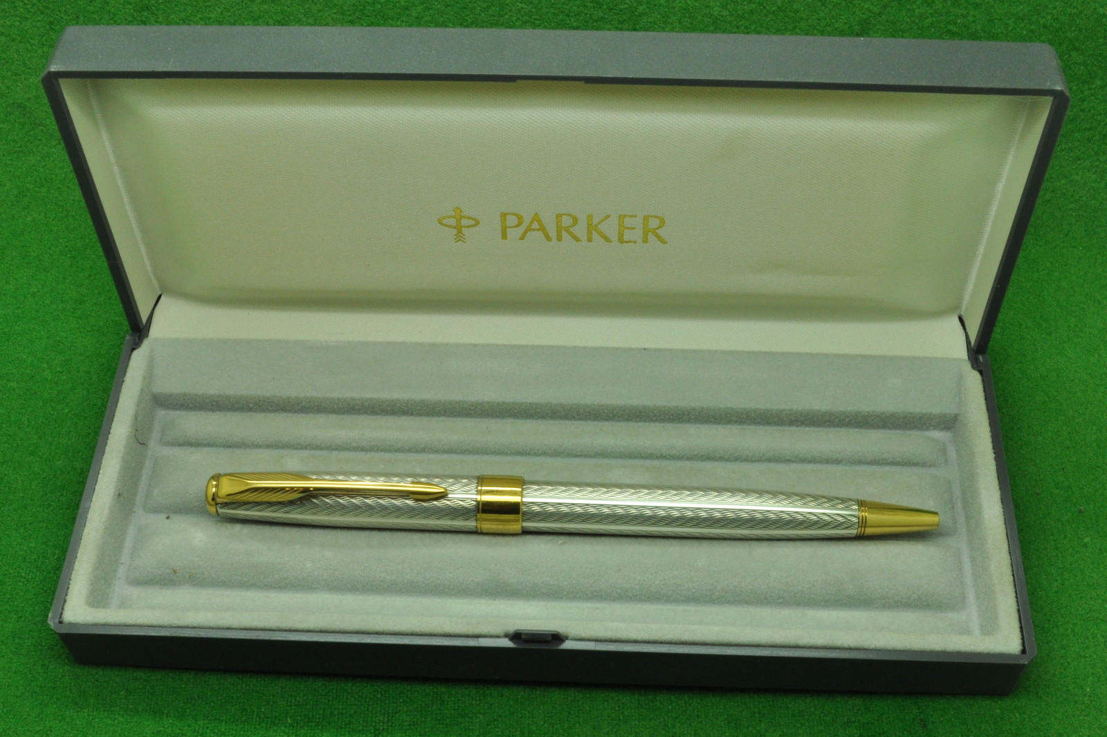 Absolutely Stunning Parker Sonnet Ballpoint In Solid Sterling Silver Fougere Pattern with gold filled trim. In Absolute MINT Unused Condition in original box
