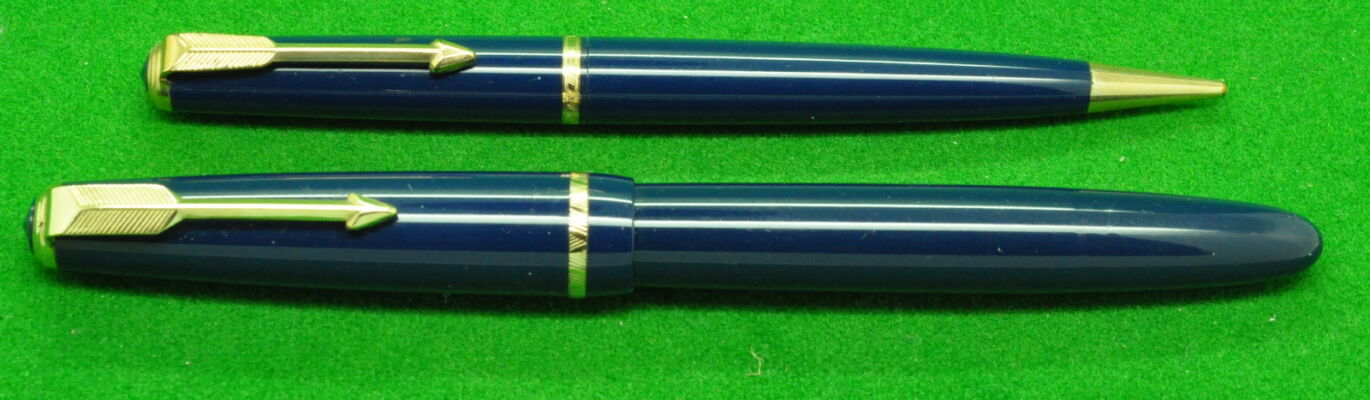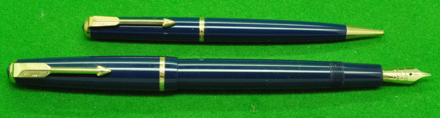 Victory Mark 5 SET in Blue with gold fill trim. Fountain Pen and Pencil In Absolute MINT Condition . Fountain Pen, aerometric fill. Fitted with the original 14kt Medium tipped nib.