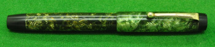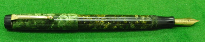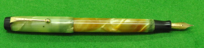 Parker Victory Mark 1 in Scarce Green Candy Stripe with Gold filled trim. In MINT Condition. Button Fill.  Fitted with the original 14kt gold  medium tipped nib.