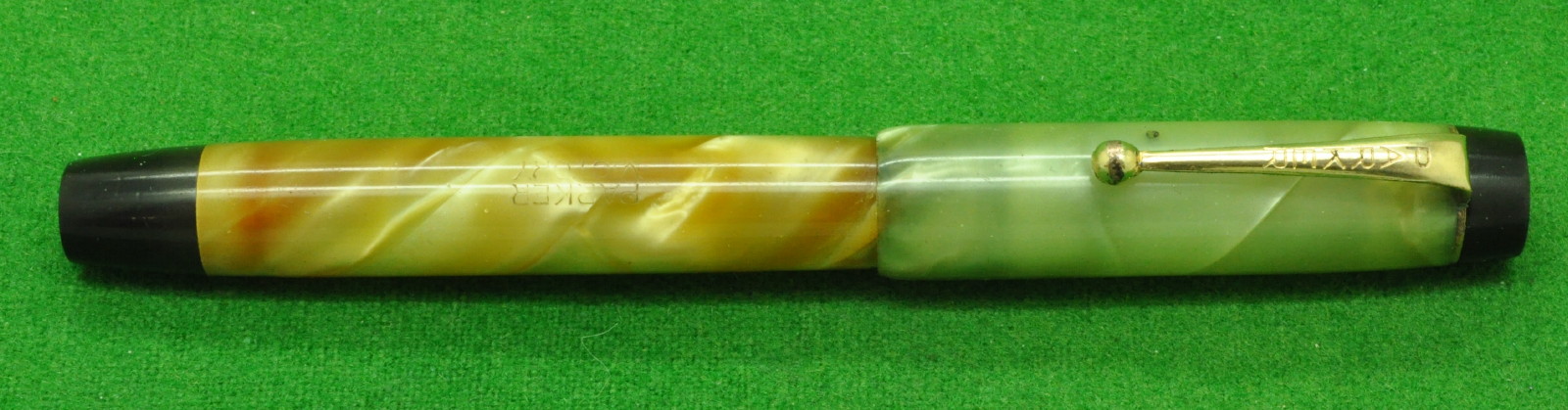 Parker Victory Mark 1 in Scarce Green Candy Stripe with Gold filled trim. In MINT Condition. Button Fill.  Fitted with the original 14kt gold  medium tipped nib.