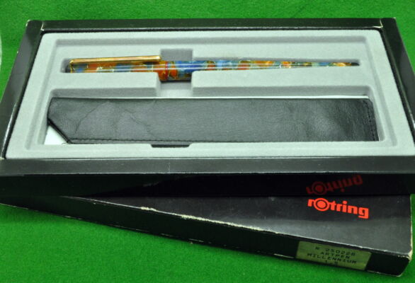 Rotring millennium Fountain Art Pen Limited Edition Year 1997 Resin Boxed. Fitted with the original Twin tone 1.5 mm wide Italic nib giving a wonderful writing style. IN MINT Unused condition in original box with Pouch and paperwork . These were limited editions with only 6000 being made