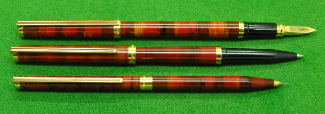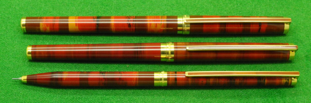 Beautiful high Quality ST Dupont Paris Trio Set in Scarce Chinese Red Banded Laque. Fountain Pen, Rollerball and Pencil. All in Absolute Mint Condition. Fountain Pen fitted with the original 18kt gold medium tipped nib.