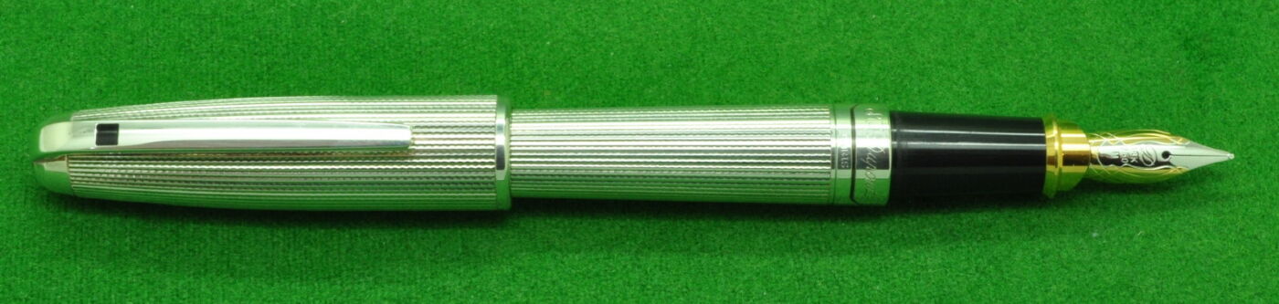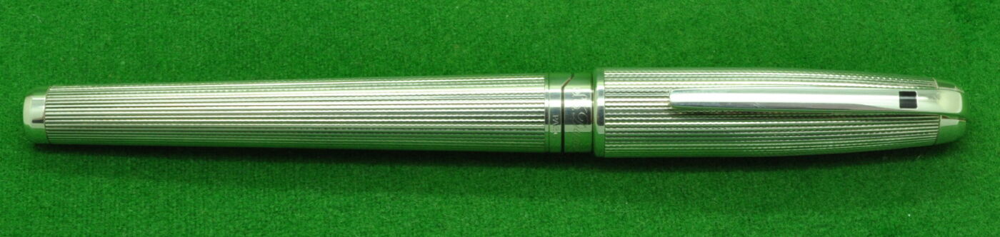 ST Dupont Olympio Fountain Pen is Silver fill Fine Barley Pattern. In MINT Unused condition in original Box with papers and Converter. Fitted with the original Twin Tone 18kt gold medium tipped nib.