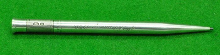 Mordan Everpoint in Solid Silver, Plain Finish. In Perfect Condition . Engraved “4th February 1939”. Fully hallmarked and dated 1938. Measures 97 mm long. Takes 1.2 mm lead.