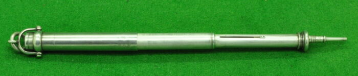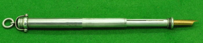 Scarce Full Size S Mordan & Co Telescopic and Slide combination Dip pen and pencil in Silver. Wonderful Dark green with Scarlet flecks finial Stone. In Perfect condition. Works Perfectly. Measures 70mm long closed and 175 mm when Pencil extended.