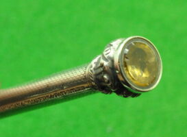 Early S Mordan & Co Makers and Patentees Slide Pencil in solid Silver with beautiful Yellow Finial Stone. In Perfect Condition but with a few small dents. Measures 90 mm long closed and 116 mm when extended.