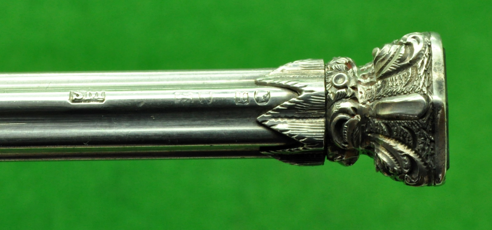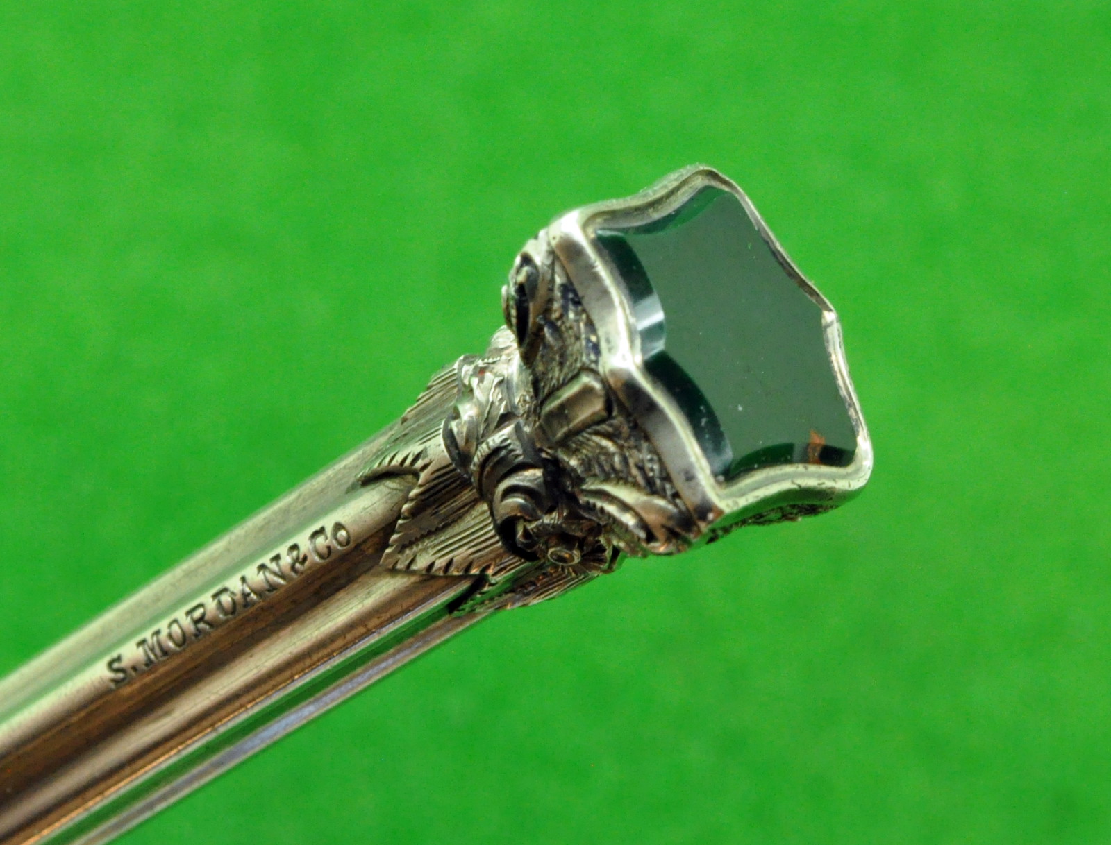 Stunning Large S Mordan & Co slide Pencil in solid Silver, with Hand Engraved Decoration and Green Stone Finial. In Absolute Mint Condition. Fully hallmarked and dated 1866. Measures . Measures 94 mm long closed and 120 when extended. Rare to find in this condition and this size.