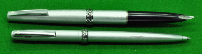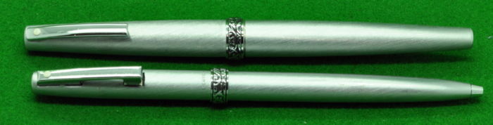 Sheaffer Lady 620 SET In Brushed Silver fill with Chrome Florentine Band. Fountain Pen and Reminder Clip Ballpoint . Both in MINT condition. Fountain fitted with the original medium tipped nib.
