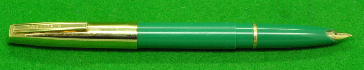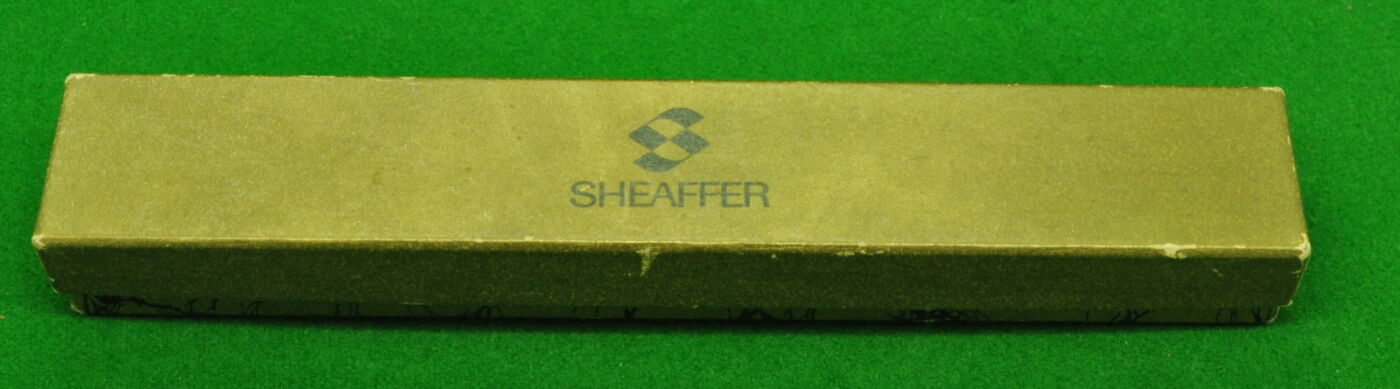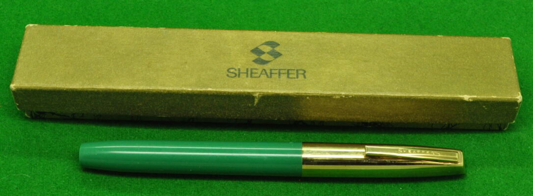 Late Sheaffer Cartridge Pen In Olive Green with gold filled cap. In MINT Unused condition in original Box. Fitted with the original  medium tipped nib.