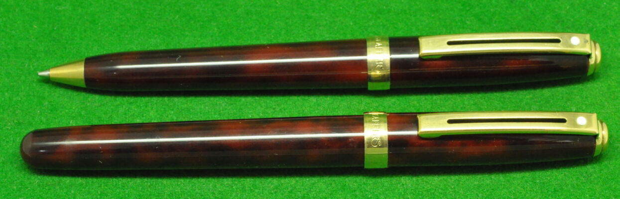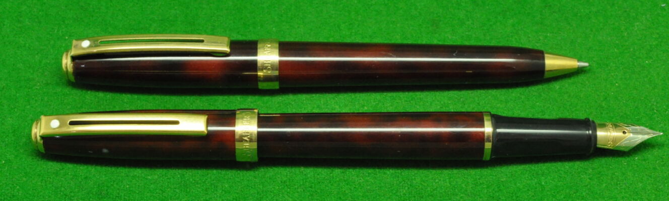 Sheaffer Prelude 359 SET In Tortoiseshell Laquer with gold fill trim. Fountain Pen and Ballpoint. Both in Mint Condition. Fountain Pen Fitted with the original twin tone, medium tipped nib