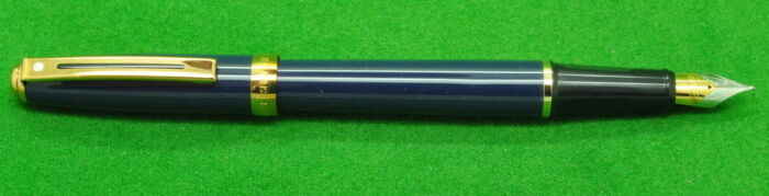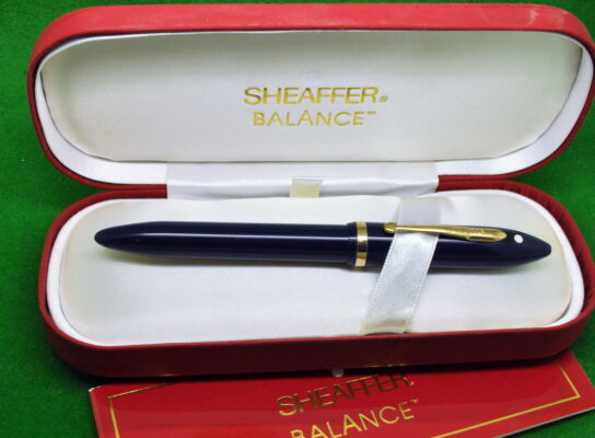 Sheaffer Balance 2 in Dark Blue with gold filled trim. In Mint Condition in original Box. Fitted with the original 18kt gold medium tipped nib
