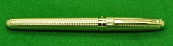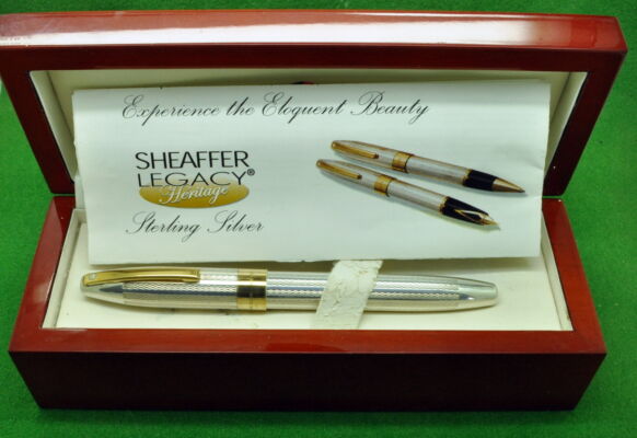 Beautiful Sheaffer Legacy Heritage 9037 in Barley Pattern Sterling Silver with gold filled trim. In Absolute Mint Condition in Original Wooden Box with papers. Few Marks inside box. Fitted with the original 18kt gold medium tipped nib