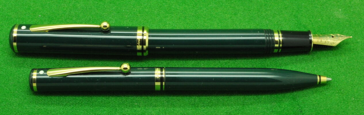 Sheaffer Connaisseur 813 Set in Ivy Green with gold filled trim. Fountain Pen and Ballpoint – both in Absolute Mint condition. Fountain Pen fitted with the original 18kt gold medium tipped nib