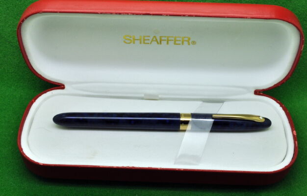 Sheaffer Crest in Ultra Marine Blue with gold filled trim. In absolute Mint Condition in original Box. Fitted with the original twin tone 18kt gold medium tipped nib.