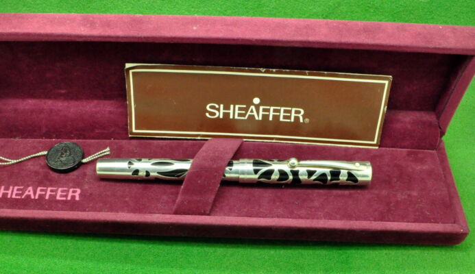 Beautiful Sheaffer Nostalgia with Solid Silver overlay. In MINT Unused condition in original Display Box. Cartridge fill but fitted with converter Fully hallmarked and dated 1986. Fitted with the original 14kt gold medium tipped nib. Highly sought after Pen