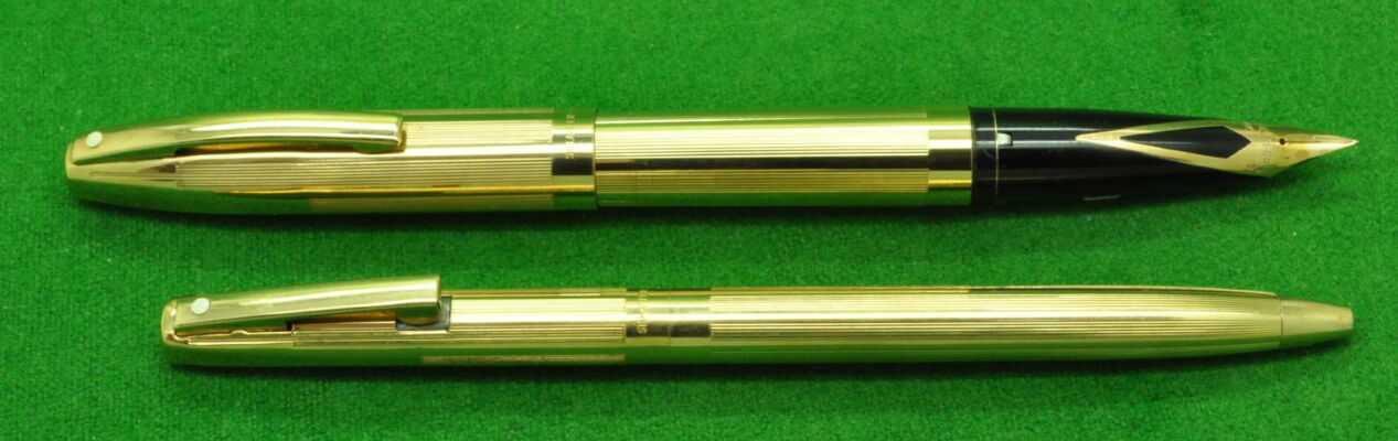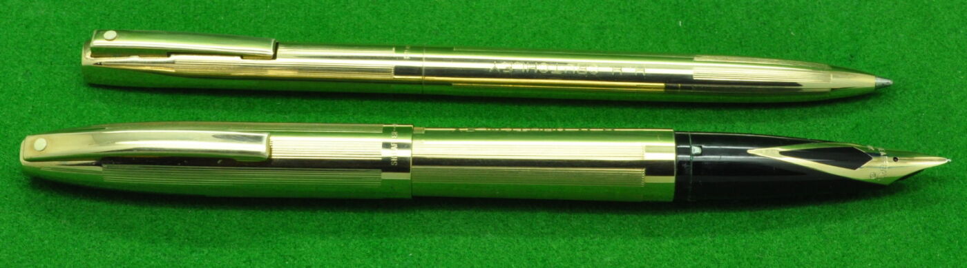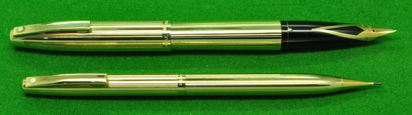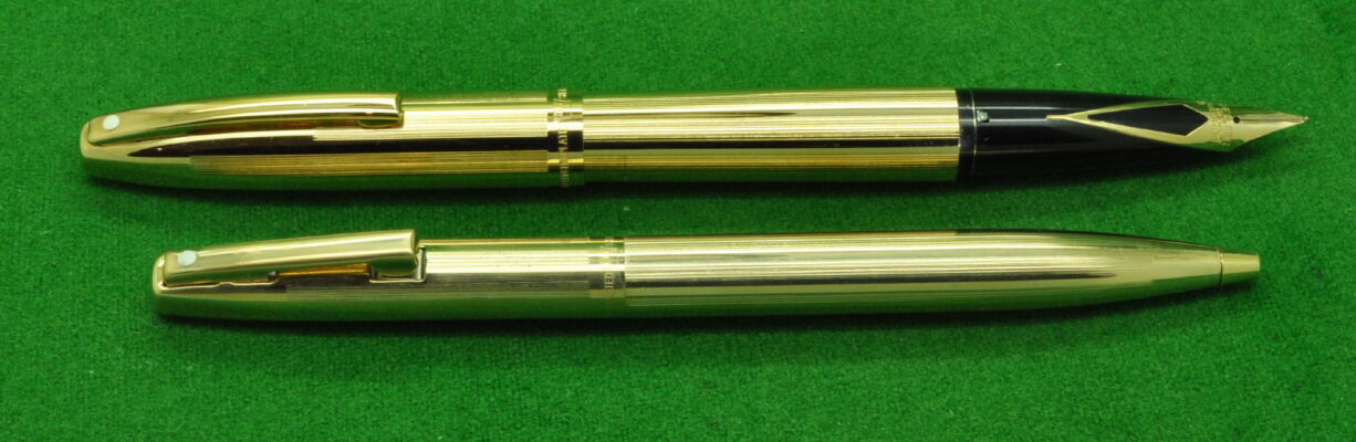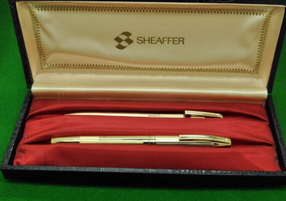 Sheaffer Triumph Imperial SET in Gold fill Parallel line pattern. Fountain Pen and Pencil. Both in absolute MINT Unused condition in original box. Fountain Pen – Cartridge fill but fitted with the original converter. Fitted with the original 14kt gold medium tipped nib.