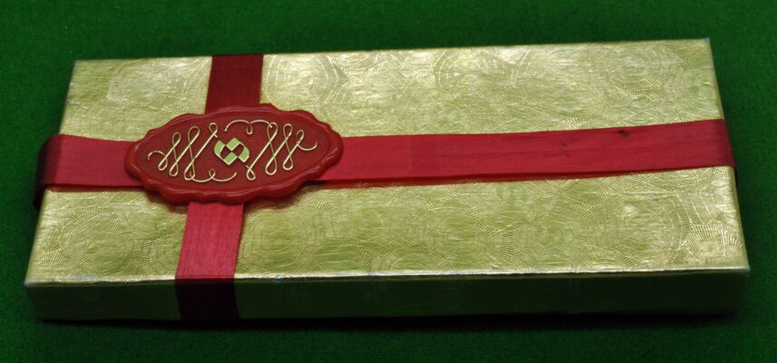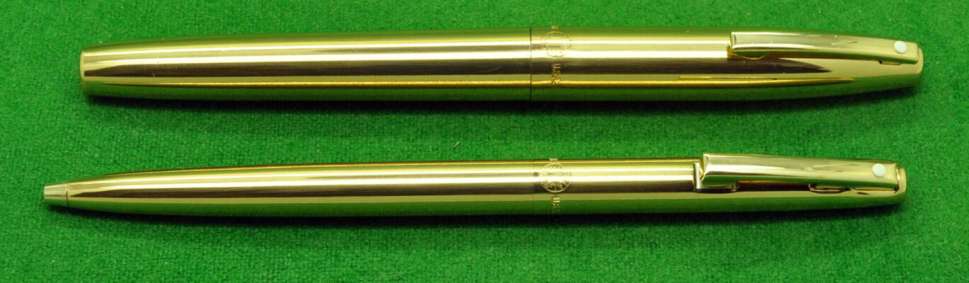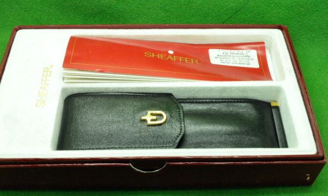 Special Edition Sheaffer Imperial Brass Set in Polished Brass. Fountain Pen and Ballpoint – Both in Absolute Mint Unused Condition in Display box with Leather Case and Brass Container. Fountain Pen fitted with the original14kt gold fine tipped nib